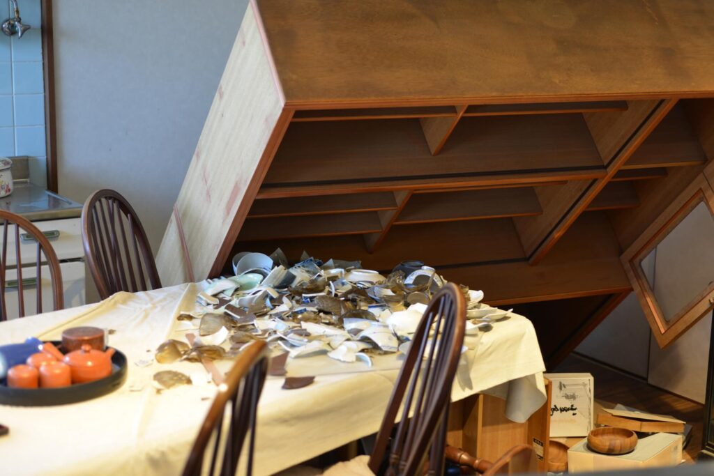 家具転倒の怖さは、倒れる瞬間だけではありません。落下物や散乱で動きにくくなり、避難や初動を妨げる点にも注意が必要です。